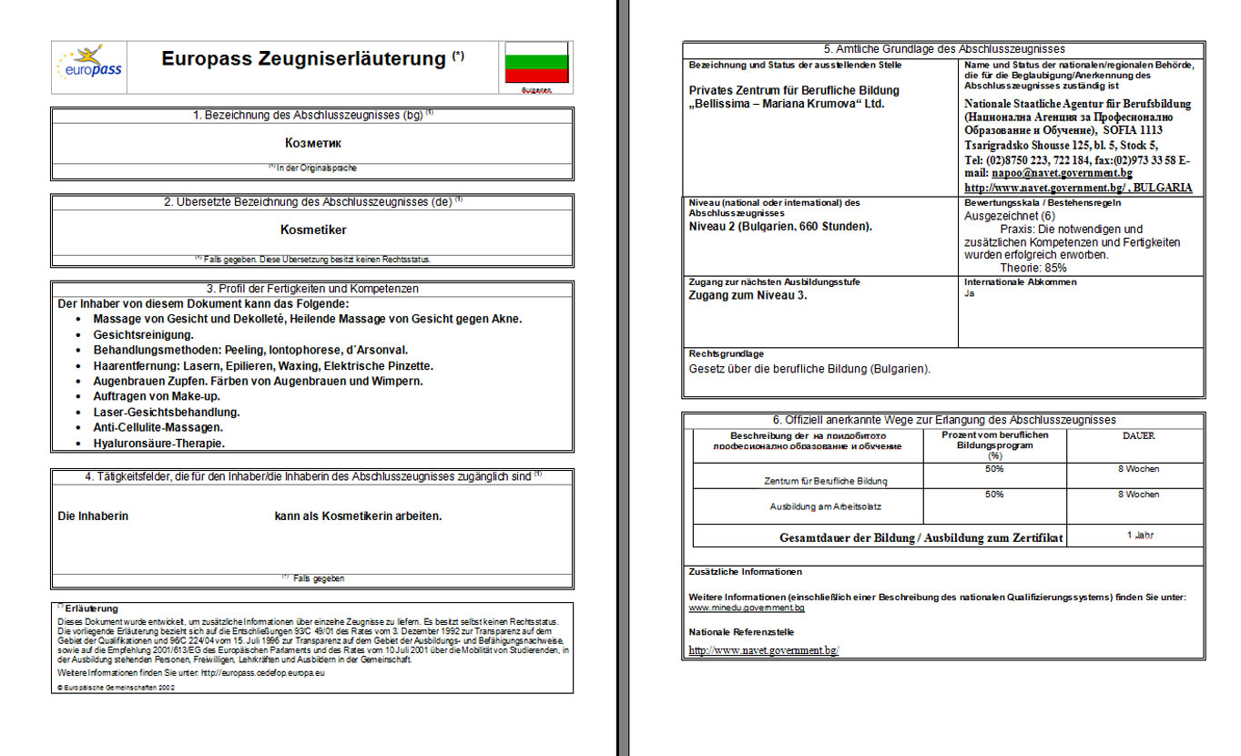 Като приложение към Държавно свидетелство, всеки завършил курса на обучение в Академия Белисима и придобил държавен документ - Удостоверение или Свидетелство, може да придобие Europass документ на избран чужд език, помагащ за по-лесна професионална реализация в Европа.